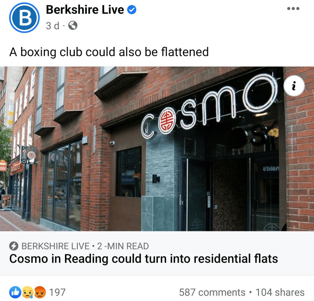 The story was picked up by Berkshire Live earlier in the week, and gathered nearly 600 comments on Facebook – more than any local news story for months. The most common sentiment was disappointment at the loss of Cosmo. The next most common theme was, presumably from those who read the article, disappointment that Cosmo would be returning. Whilst the planners and councillors debate bat boxes, bin storage and being carbon neutral, it appears the Reading public is mostly interested in whether this development is Cosmo neutral.
