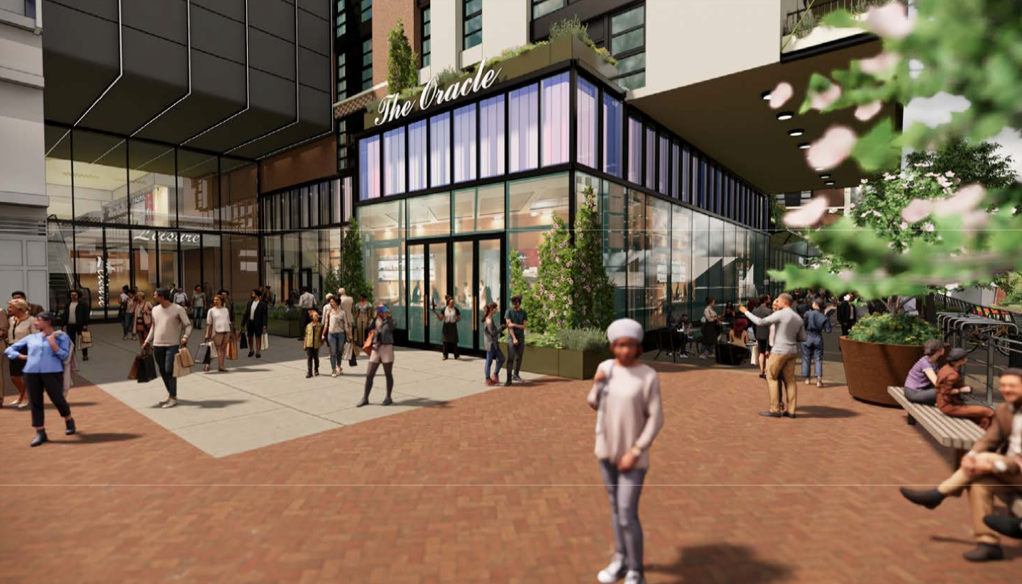 Above is the Debenhams riverside corner, with a new entrance to the mall. If you look closely on the left you can make out two escalators that would take you up to the lower shopping mall where HMV still lurks. Also accessed from this entrance would be a new leisure unit at the riverside level. It’s not a huge space, due to the retail back-of-house space that’s retained, but I could imagine some kind of sport-themed leisure/bar operating here – a Puttshack or Sixes etc. A restaurant would take the protruding corner of the plot enjoying high visibility, but remember we lose the existing two restaurants, currently Real Greek and Franca Manca. The planning statement suggests that existing tenants will be offered the opportunity to relocate elsewhere within the Oracle so it might not spell the end of your favourite restaurant. The remainder of the riverside frontage becomes the residential entrance and a two-storey co-working office. The intention here is to keep the area in use all day rather than just for the lunchtime and evening restaurant trade.