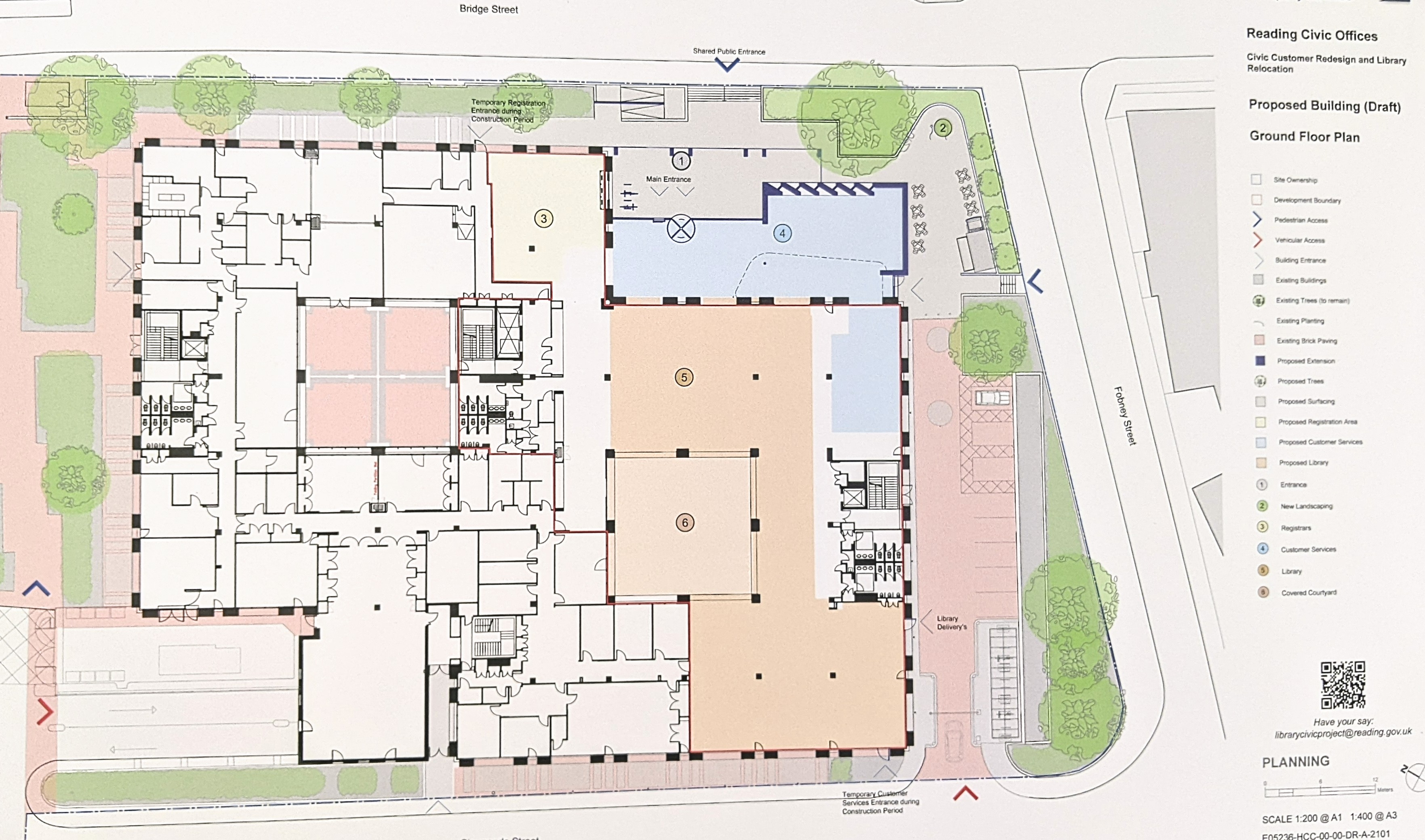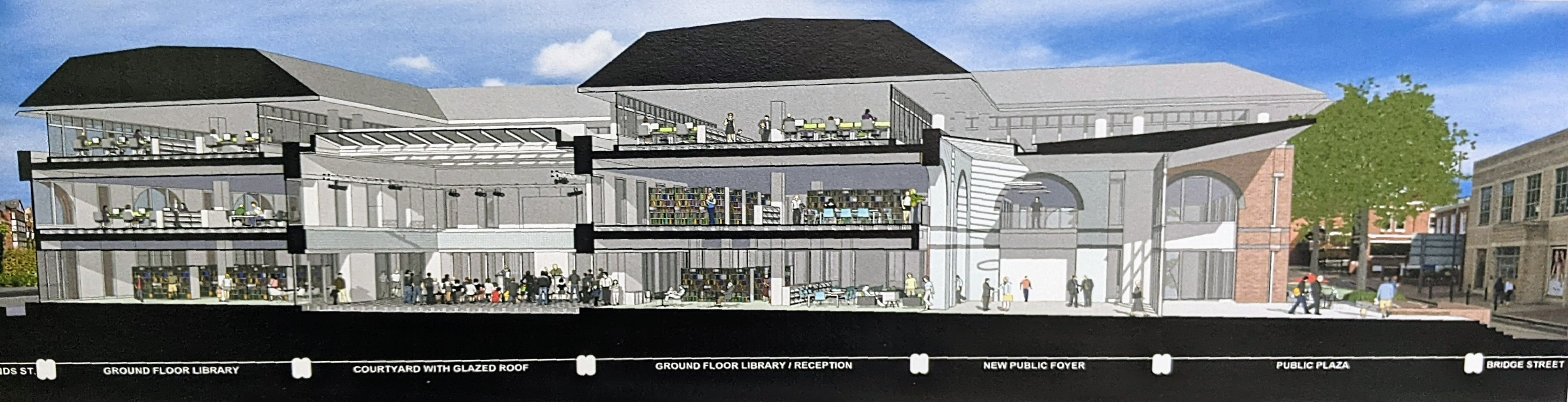 Plans for the relocated library were revealed in the summer. Facilitated by a government levelling up grant, the idea is to move the central library provision from Kings Road to the civic offices on Bridge Street. The building will be extended at its existing entrance to provide a larger reception area. The library itself will be housed in a chunk of vacated office space on ground and first floors. The highlight of the scheme is actually not the front foyer extension but a plan to roof over an existing internal courtyard to create a new hall, shown illustratively here for talks. This should allow the library to broaden its use, and gives the civic offices a more coherent overall function as the council’s presence in town.