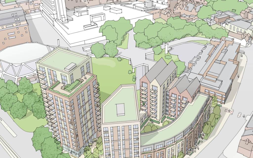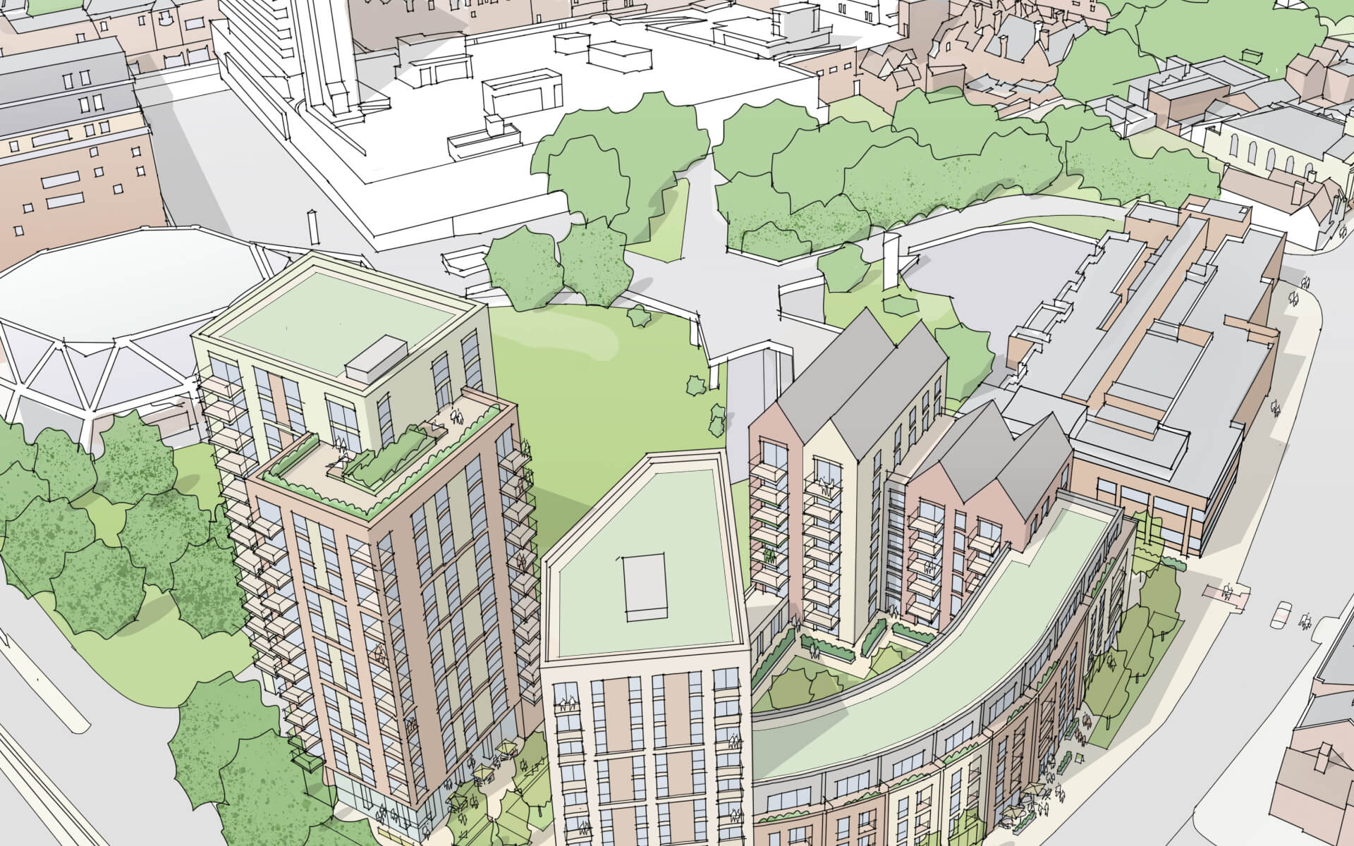 Sensible plans have come forward for the listed Natwest building on Market Place, but the long-vacant period buildings opposite remaining obstructed by some kind of issue in planning since new owners came on board. And we await a likely residential proposal for the old central library – take a look at the context sketch of town used by the Oracle to show their scheme… curious.