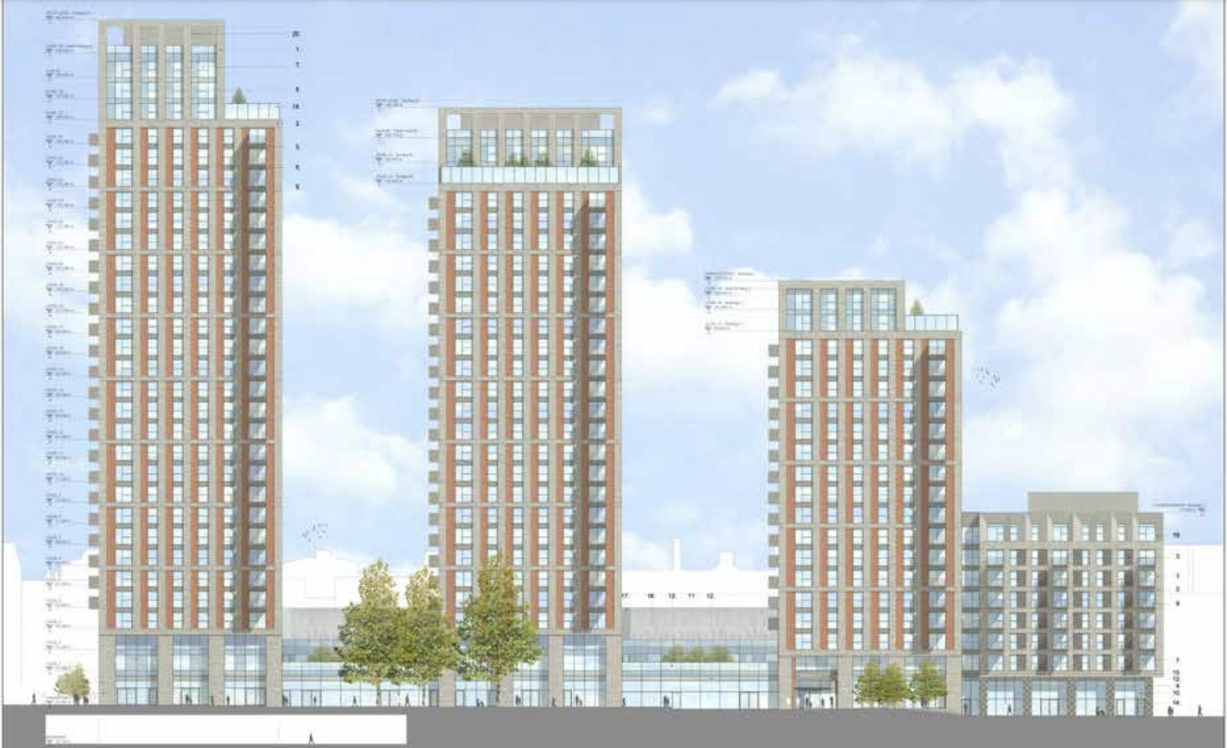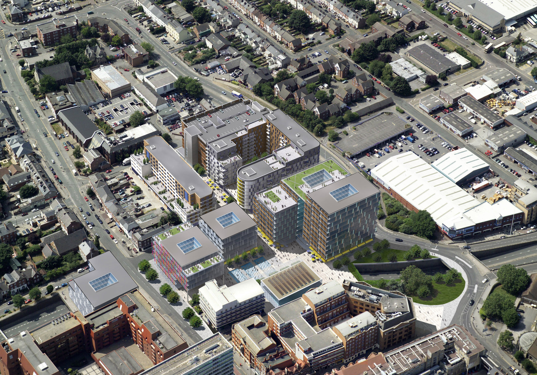 The towers have been increased slightly in height as plans have progressed, to a maximum of 97.5 metres at the western end. This will be the highest point of the wider “Minster Quarter” regeneration: the same developer has recently signed up with the council to build further apartments (including 30% affordable units) on the vacant former civic centre site, illustrated in grey in the foreground on the CGI below.