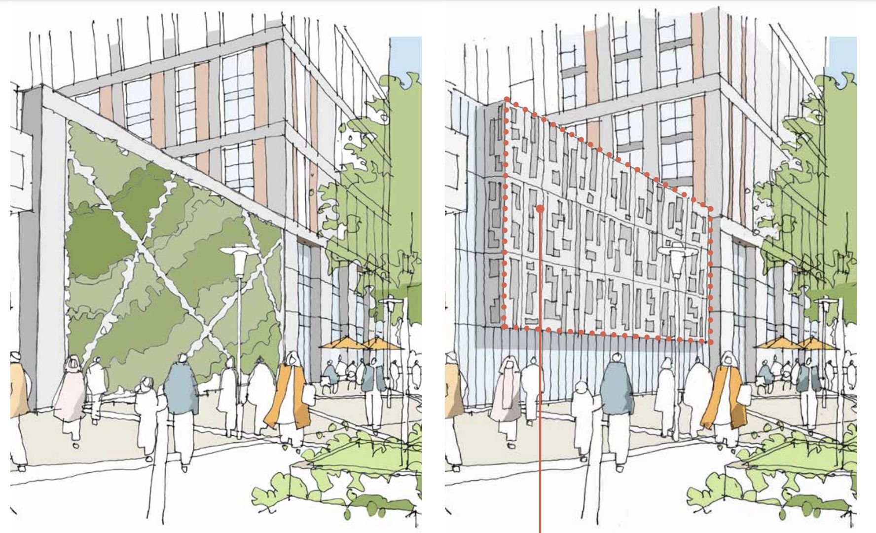 The Tetris-piece car park frontage will be lost to the wrecking ball, but following feedback at the exhibition last year, multiple efforts are being made to honour its legacy. The shapes will be incorporated into paving at places around the re-landscaped perimeter, as well as in art installations. A section of wall screening the replaced car park ramps, which was intended as a green wall, is now proposed as a new interpretation of the same pattern work.