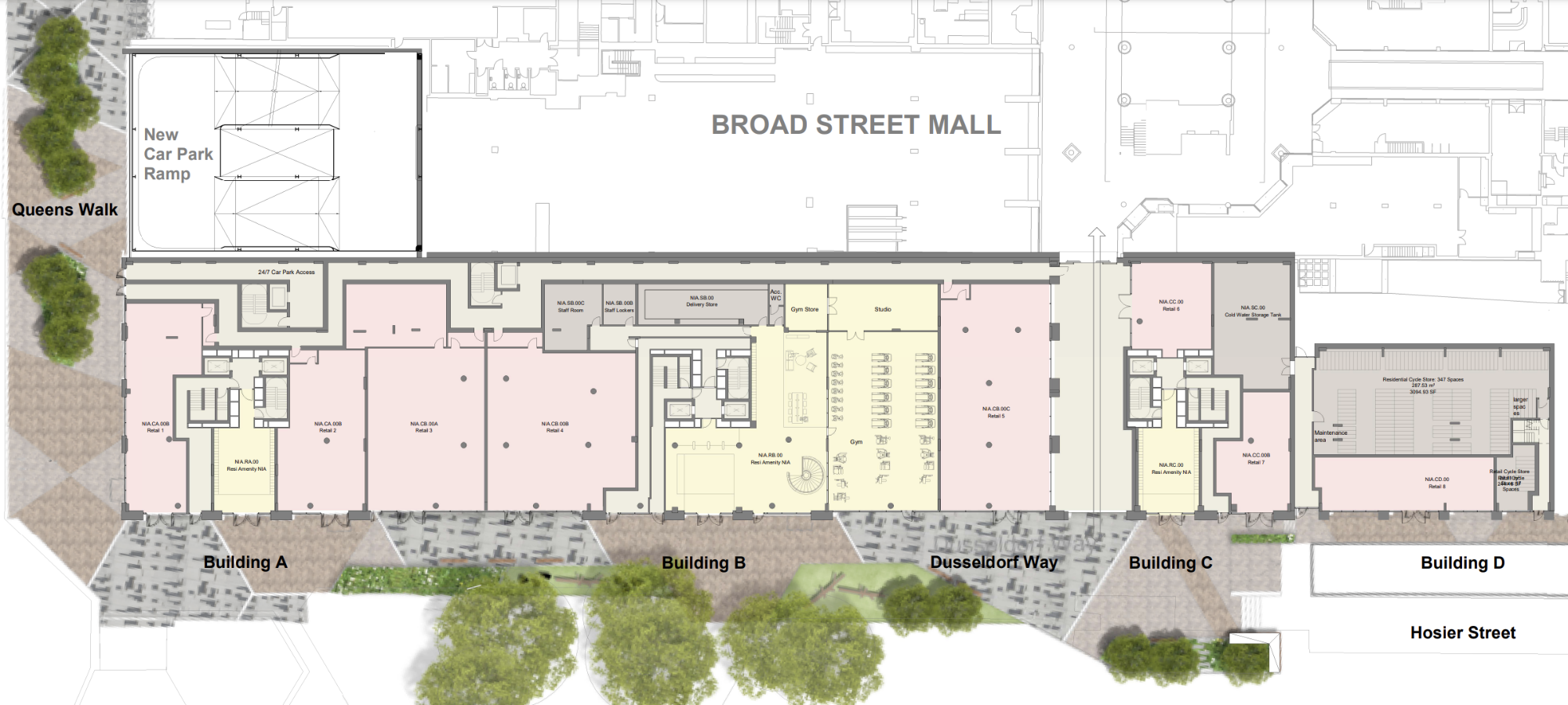 Plans have been submitted by McLaren Living for a residential-led regeneration of the Broad Street Mall. It’s now over five years since previous owner Moorgarth submitted similar plans, and 7 months since I wrote up the planning exhibition ahead of this new submission. That more recent design has been revised somewhat, but to avoid confusion with multiple comparisons to different plans, let’s just take a look at these final proposals (also available on their consultation website and display boards upstairs in the mall).