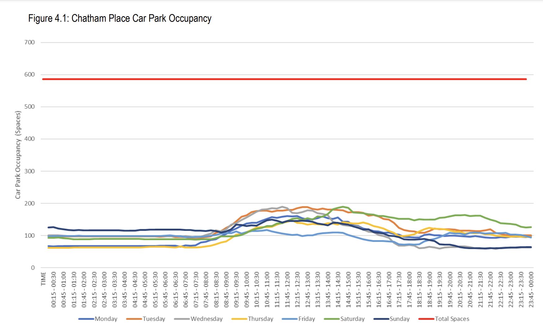 The current mall car park has 784 spaces. As a result of the development this will drop to 494, a reduction of 290. But 100 spaces will be allocated specifically to residents of scheme. This leaves a revised capacity of 394 spaces for shoppers and visitors. Statistics of car park usage are provided, based on a surveyed week in November. I’ve added the dotted line to illustrate that this revised capacity would actually be hit six days per week, and for many hours per day. So whilst it is true that the mall doesn’t reach its parking capacity (in normal times at least), its needs would not be met most days by the new arrangement. I think if retail and customer convenience were truly at the heart of the mall owner’s priorities this would be looked at more closely, perhaps by insisting on retaining most of those 100 spaces given to residents (except those needed for disabled residents and potentially a car club), or by adding a floor the the remaining car park to compensate. Instead they argue that other car parks can ride to the rescue.