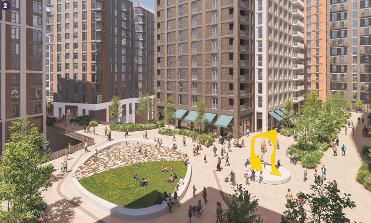 They’ve done a great job with the public art around the site so far. The illuminated artwork covering the station underpass is frequently positively commented upon, and I really like the yellow flag flutter-effect thing in front of the office tower. I’m not so sure about “The seed”, but the plan is now to move that yellow sculpture further along an enlarged central Station Hill Square, allowing a lawn to be created beside the fountains. This improved space is the highlight of the latest plans, with two new cafes or restaurants to front the square at the base of a new 20-floor residential tower.