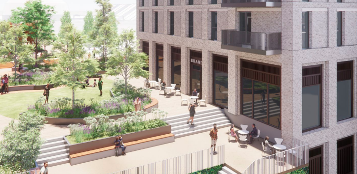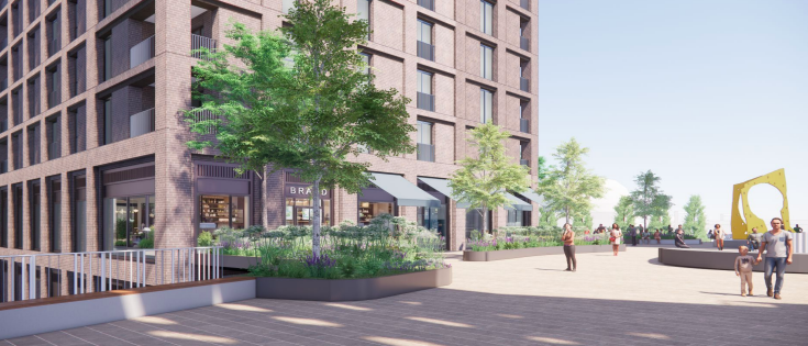 A view of the central square at Station Hill with the new residential buildings behind