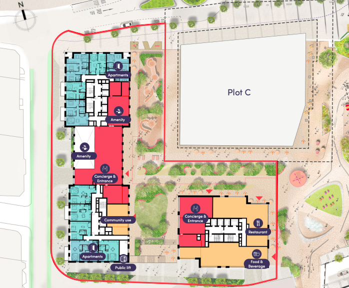 Meanwhile the apartment buildings proposed here are much closer to the approved height limits, indicating keener market demand for residential. Although, I should add that the design put forward steps down in height to break up the built form, and a gap is left between plots AB and D that could have been filled for increased density. The architect at the exhibition explained to me that they wanted to maximise daylight into the flats to offer the best quality of life. That ruled out the full continuous L-shape design, and with it reduced the plan from a theoretical maximum of 750 units to the proposed 600. Within that, 12.5% would be affordable housing. It’s always complicated assessing the finer details but I think that’s slightly in excess of the 10% agreed as part of the outline consent back in 2020.
